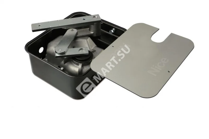 - Привод NICE ME3024 (подземный мотор) в сборе с соединительным рычагом и механическим упором на закрытие — 1 шт.