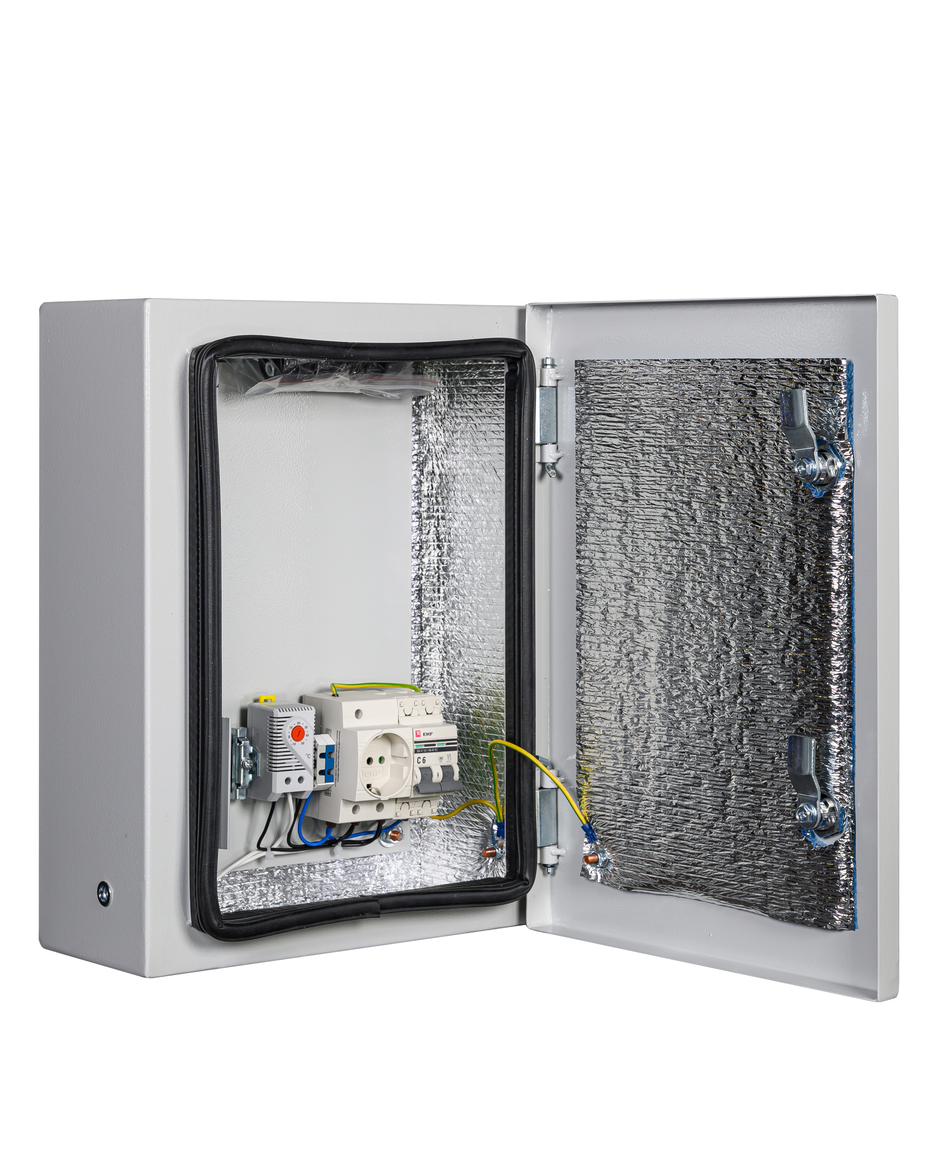 утеплитель из порилекса, замок 2 шт,ключ 1 шт, монтажная плата 1шт, гермовводы 2 шт (MG-25), розетка 1 шт, автоматический выключатель, 6А 1шт, клемма для подключения оборудования 2 шт, клемма заземления 1 шт, термореле 1шт, нагреватель мощностью 50 Вт 1шт.