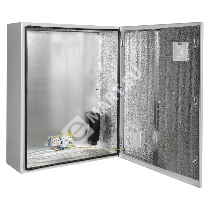 утеплитель из порилекса, замок 2 шт, ключ 1 шт, монтажная плата 1шт, гермовводы 5 шт (MG-25), розетка 1 шт, автоматический выключатель, 6А 1шт, клемма для подключения оборудования 2 шт, клемма заземления 1 шт, термореле 1шт, реле предстарта 1 шт, вентиляционная решётка с фильтром 2 шт, нагреватель мощностью 150 Вт 2 шт.