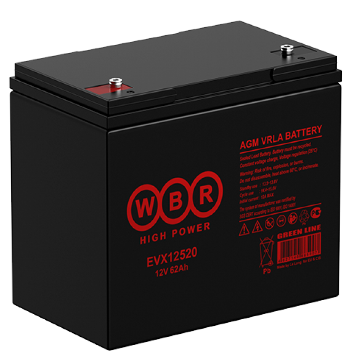 Аккумулятор WBR EVX12520S - герметизированная, выполненная по технологии AGM, тяговая свинцово-кислотная аккумуляторная батарея. Обладает высоким качеством и надежностью, устойчива к глубоким разрядам и применяется для питания электрических транспортных средств, гольфкаров, газонокосилок, полотерных и поломоечных машин, медицинских колясок, электроинструмента, электронасосов, эхолотов, осветительных приборов, в том числе и наружного освещения, и другого вспомогательного оборудования.