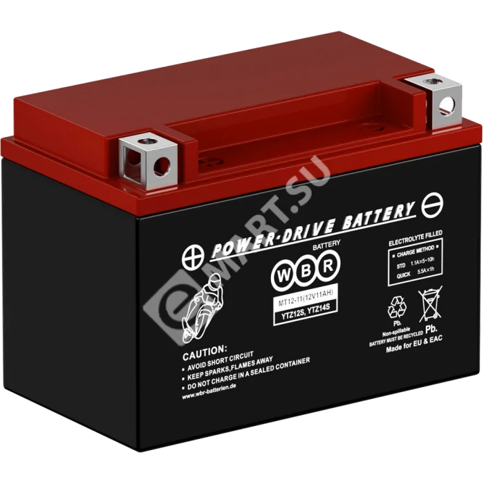 Аккумулятор WBR МТ12-11 - герметизированная, выполненная по технологии AGM, необслуживаемая (MF) стартерная мотоциклетная свинцово-кислотная аккумуляторная батарея. Обладает высоким качеством и надежностью. Она предназначена для запуска двигателя мотоциклов, скутеров, гидроциклов, квадроциклов, снегоходов и мотовездеходов. Батарея соответствует техническим характеристикам и является аналогом мотоциклетных аккумуляторных батарей YUASA моделей YTZ12S и YTZ14S.